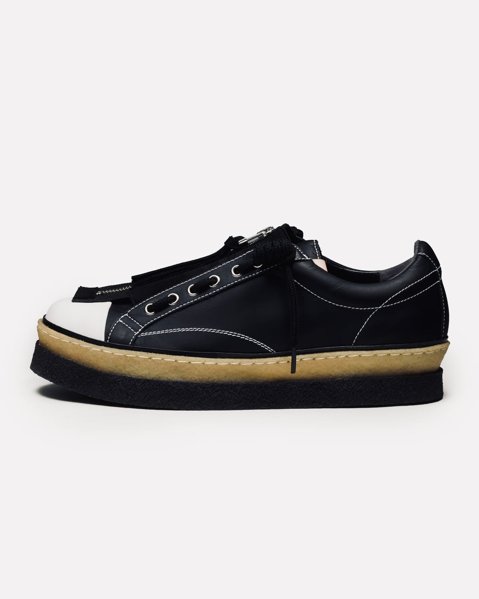 ベーシックなスニーカーのアッパーにクレープソールを巻いたモデルです。その特徴的なデザインは、つま先まで伸びたセンタージップパーツを採用し、脱ぎ履きが容易に行えるとともに、クラシカルなデザインにアクセントを加えています。