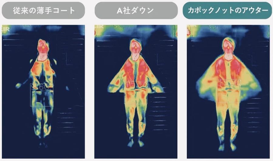 一般的なダウンジャケットさながらの暖かさを備えつつ、一般的なものと異なり、薄いから着膨れ感はなく、羽毛を使っていないため羽も飛び出ることはありません。
