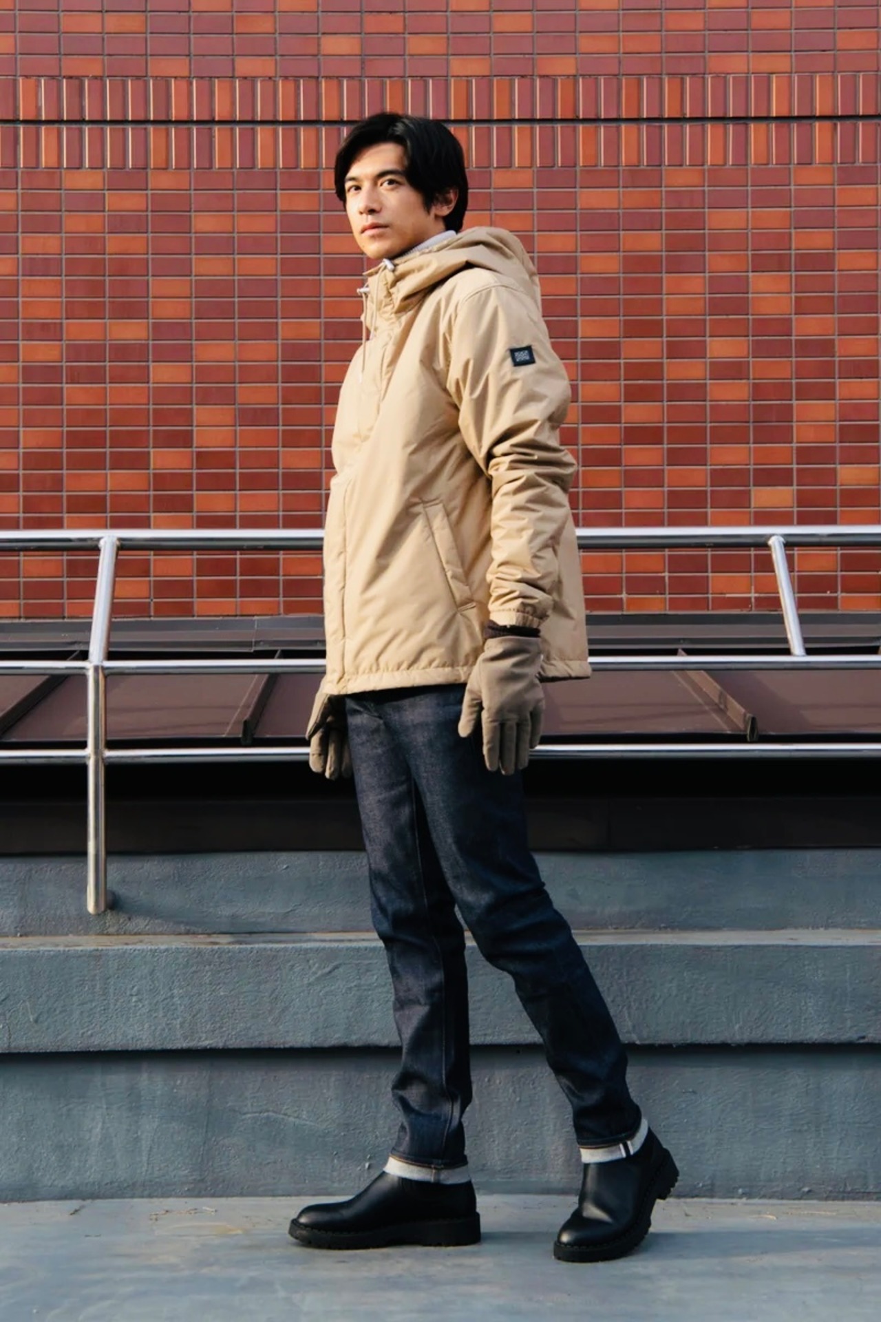 特殊4層構造の表地を高密度に編み込むことで、雨がしみにくく、傘の20倍の耐水圧で水滴を弾くため、防寒能力を維持。ケアもしやすくシワになりにくい作りです。