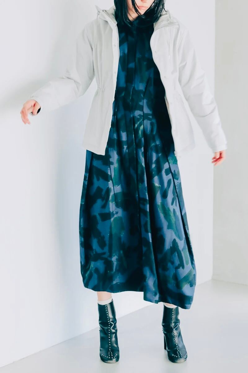 特殊4層構造の表地を高密度に編み込むことで、雨がしみにくく、傘の20倍の耐水圧で水滴を弾くため、防寒能力を維持。ケアもしやすくシワになりにくい作りです。