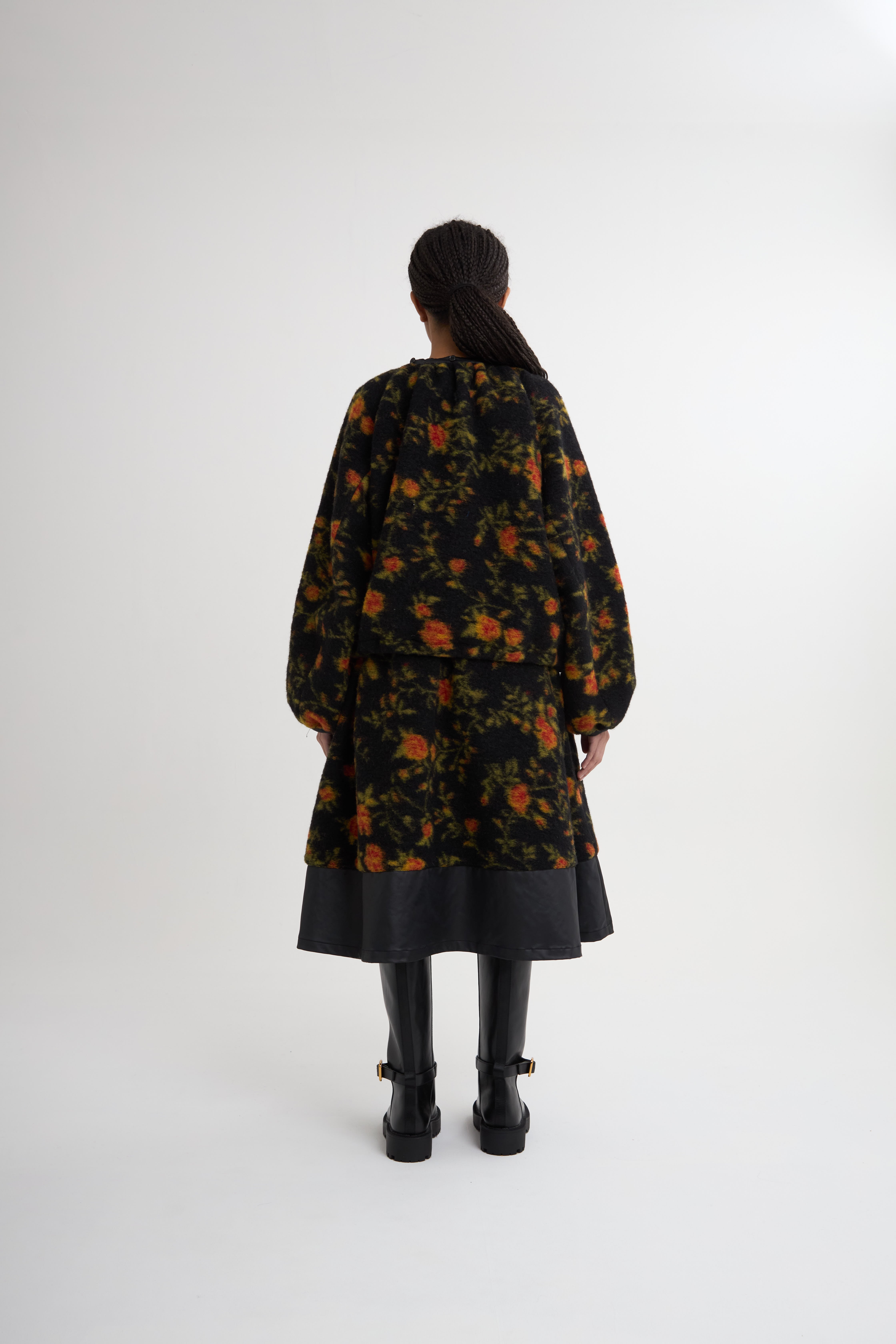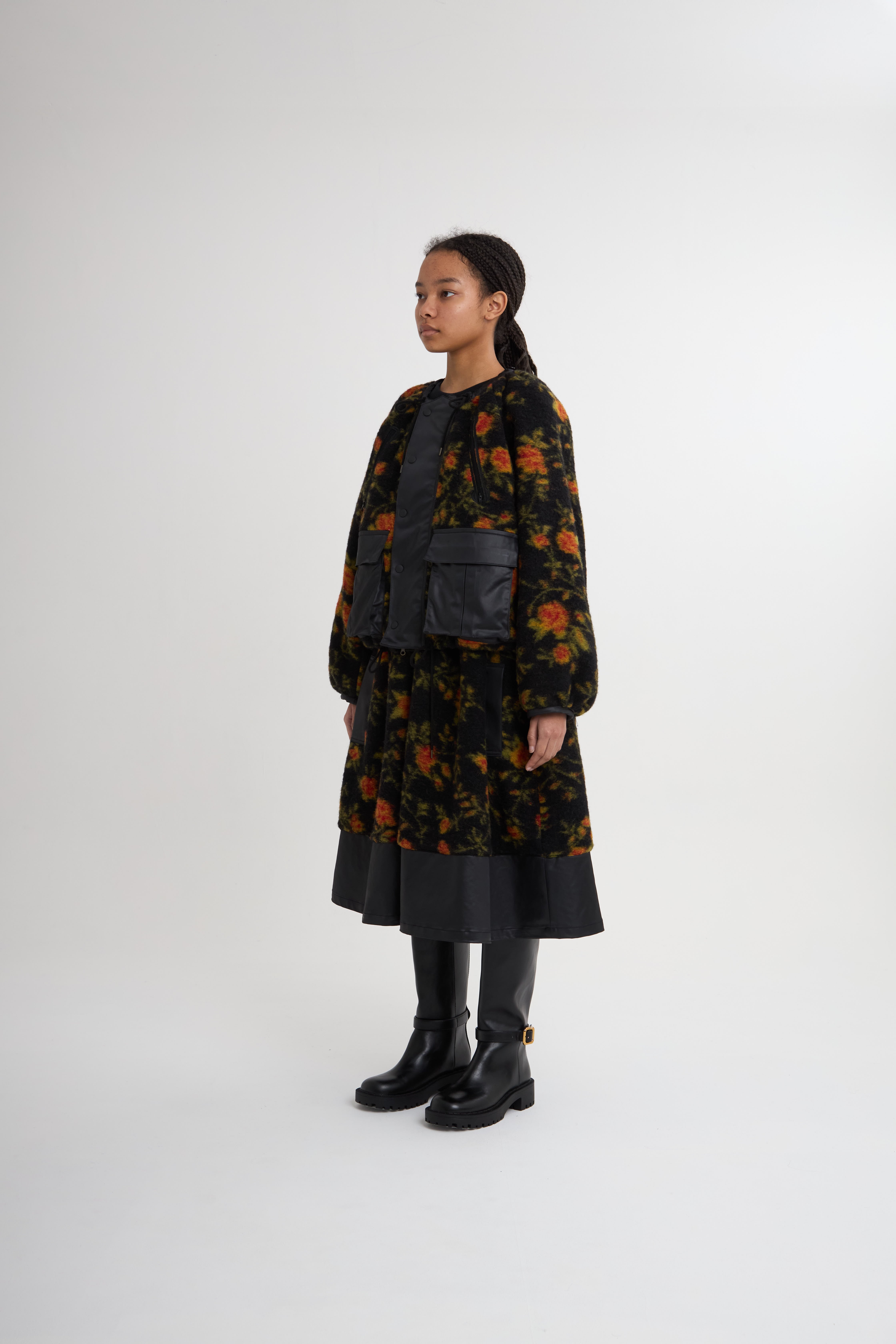 イタリアで編まれたオリジナルのバラ柄の、軽くて暖かなジャガードボア素材を使用。