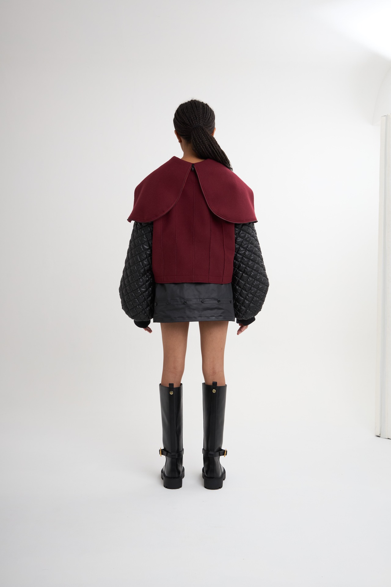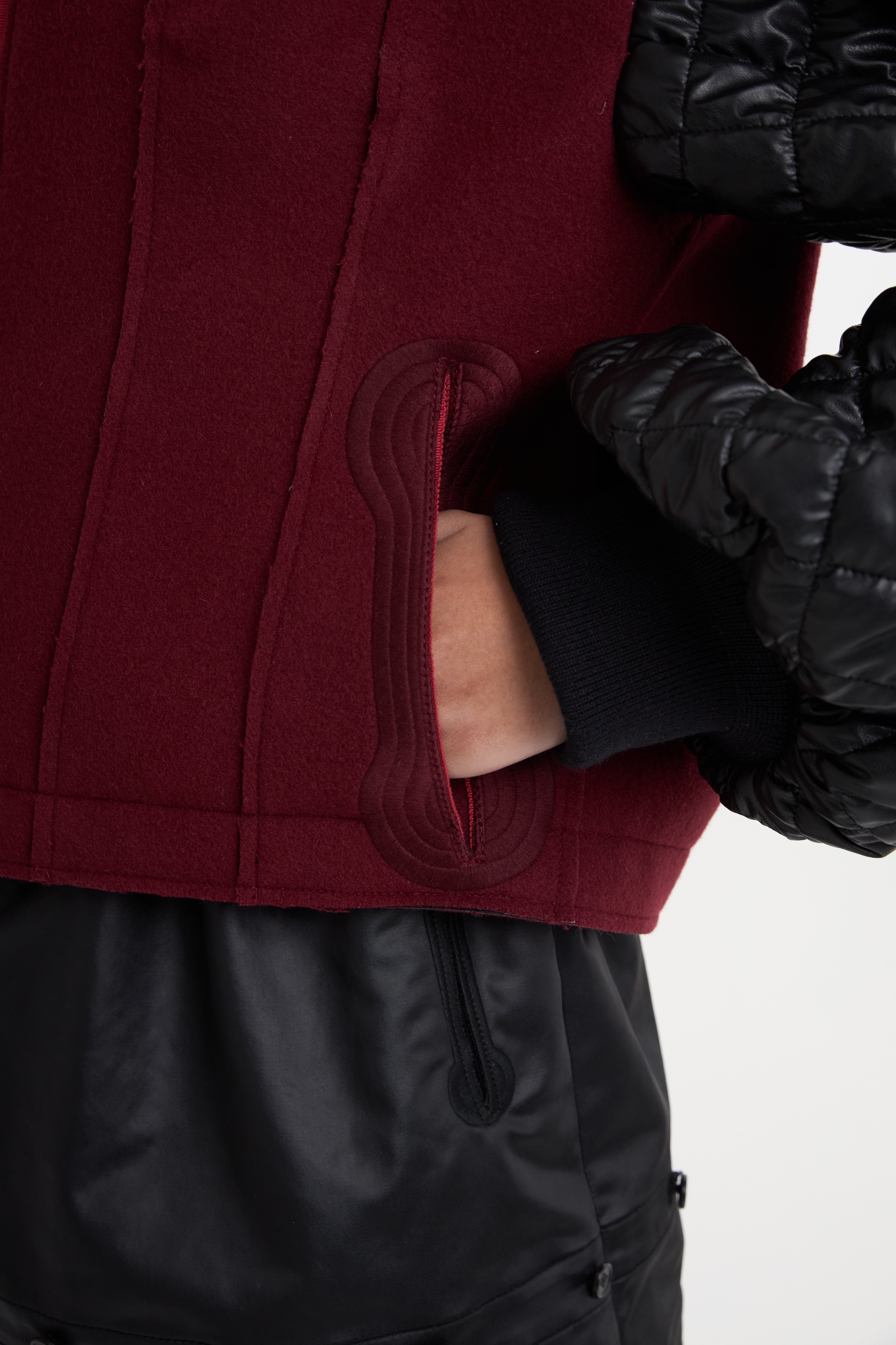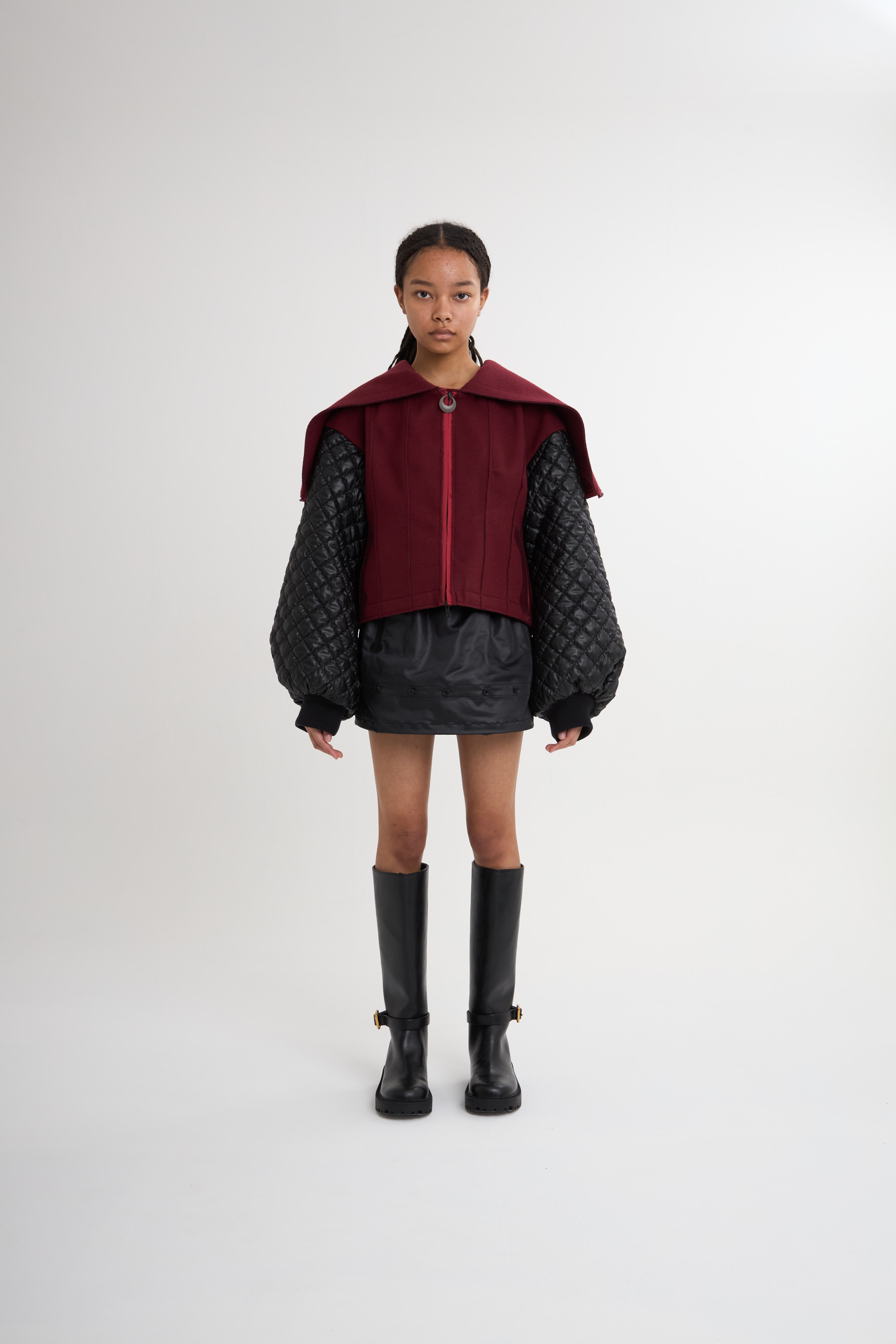 ボディは日本の一大ウール産地である、尾州産地で作られた、ウールモッサーに防風フィルムが入った裏地兼用のトリコット芯をボンディングしたMEGMIURAを代表する素材を用いています。袖は極薄の合皮を伸縮のある糸でキルティングに仕上げています。襟はZipを閉じることでフードになります。シグネチャー刺繍ボタンホールとポケットがポイント。