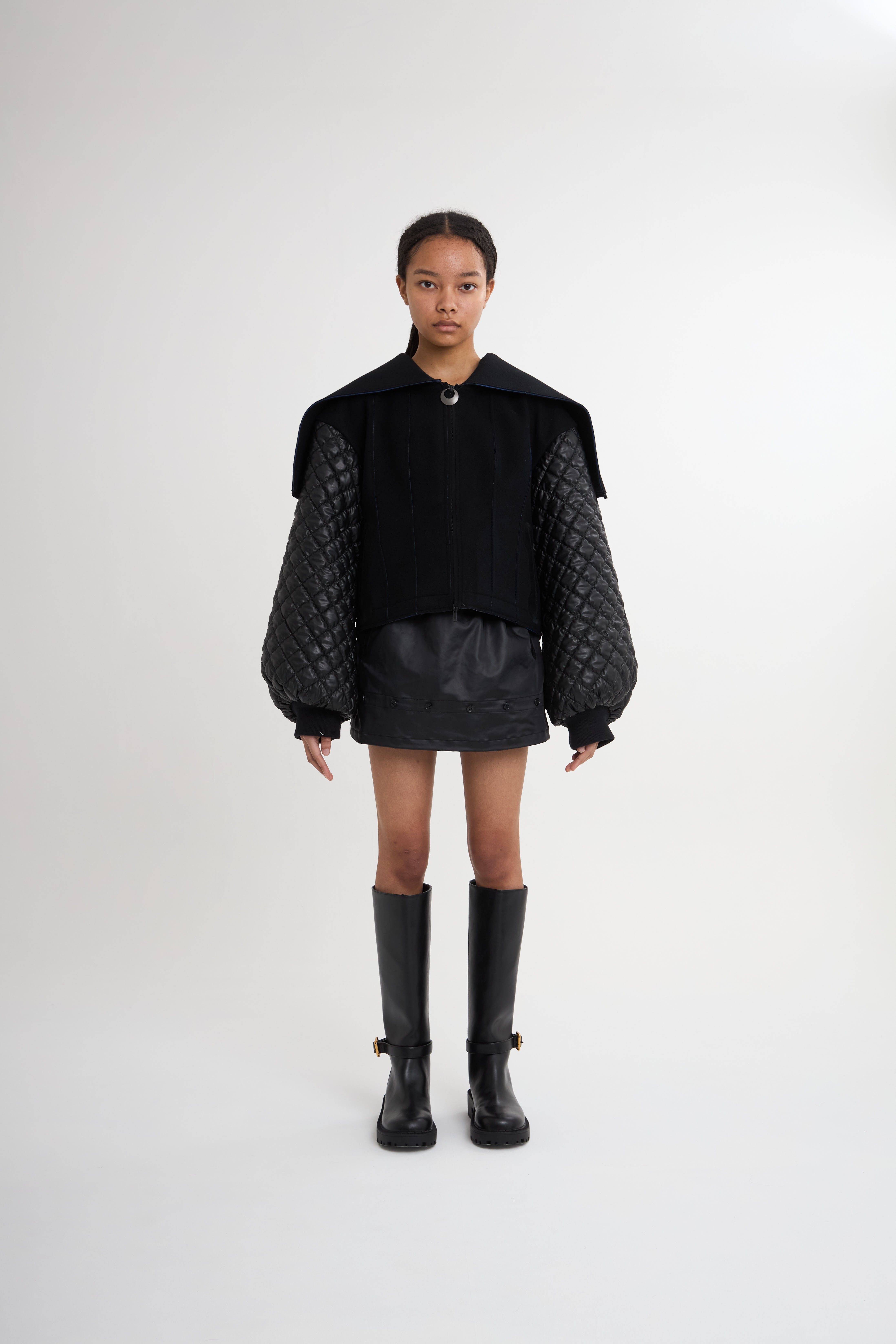 ボディは日本の一大ウール産地である、尾州産地で作られた、ウールモッサーに防風フィルムが入った裏地兼用のトリコット芯をボンディングしたMEGMIURAを代表する素材を用いています。袖は極薄の合皮を伸縮のある糸でキルティングに仕上げています。襟はZipを閉じることでフードになります。シグネチャー刺繍ボタンホールとポケットがポイント。