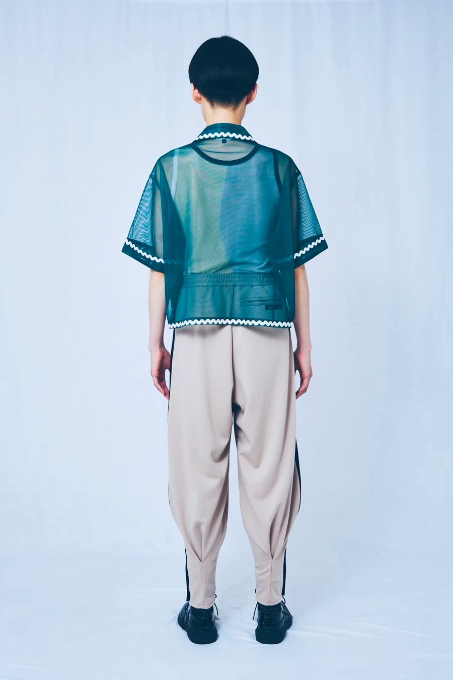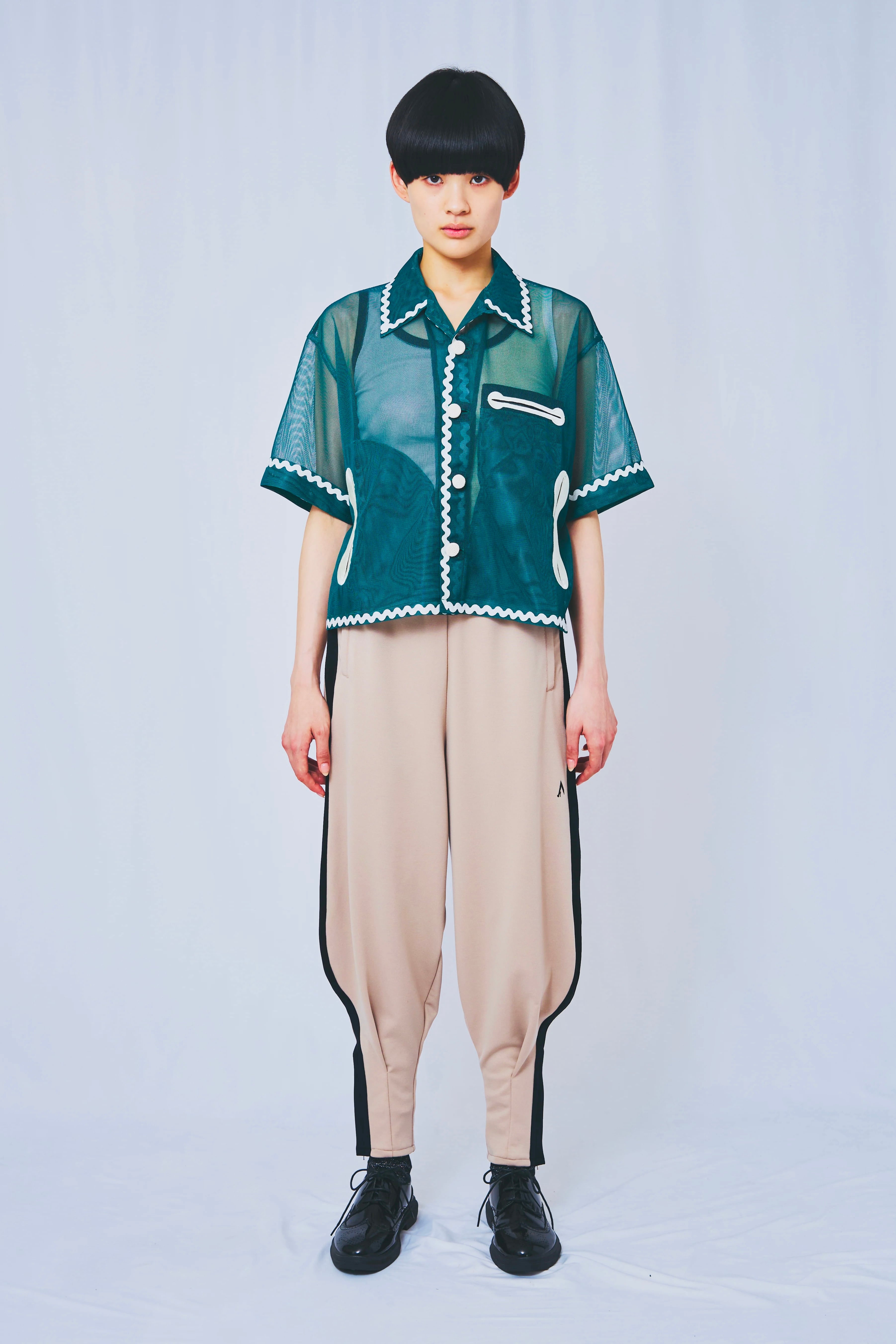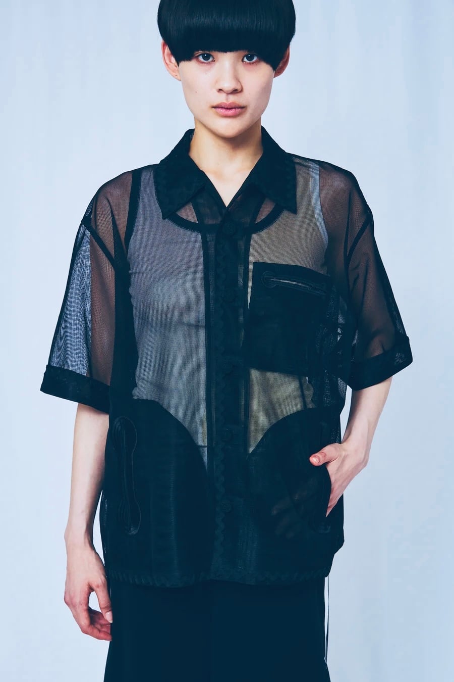薄手のシャンブレーメッシュを使用したシャツジャケットデザイン。透け 感を楽しむことができます。胸ポケットと腰ポケットがシグネチャー刺繍 ポケット仕様。