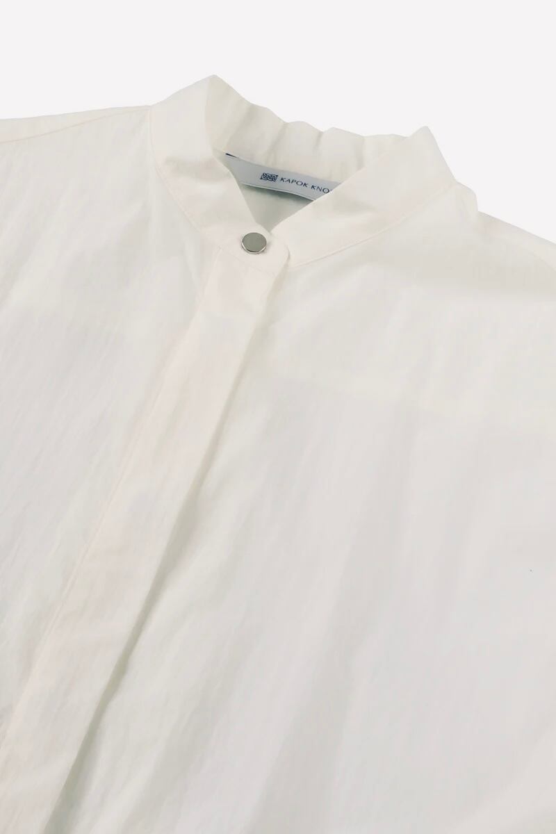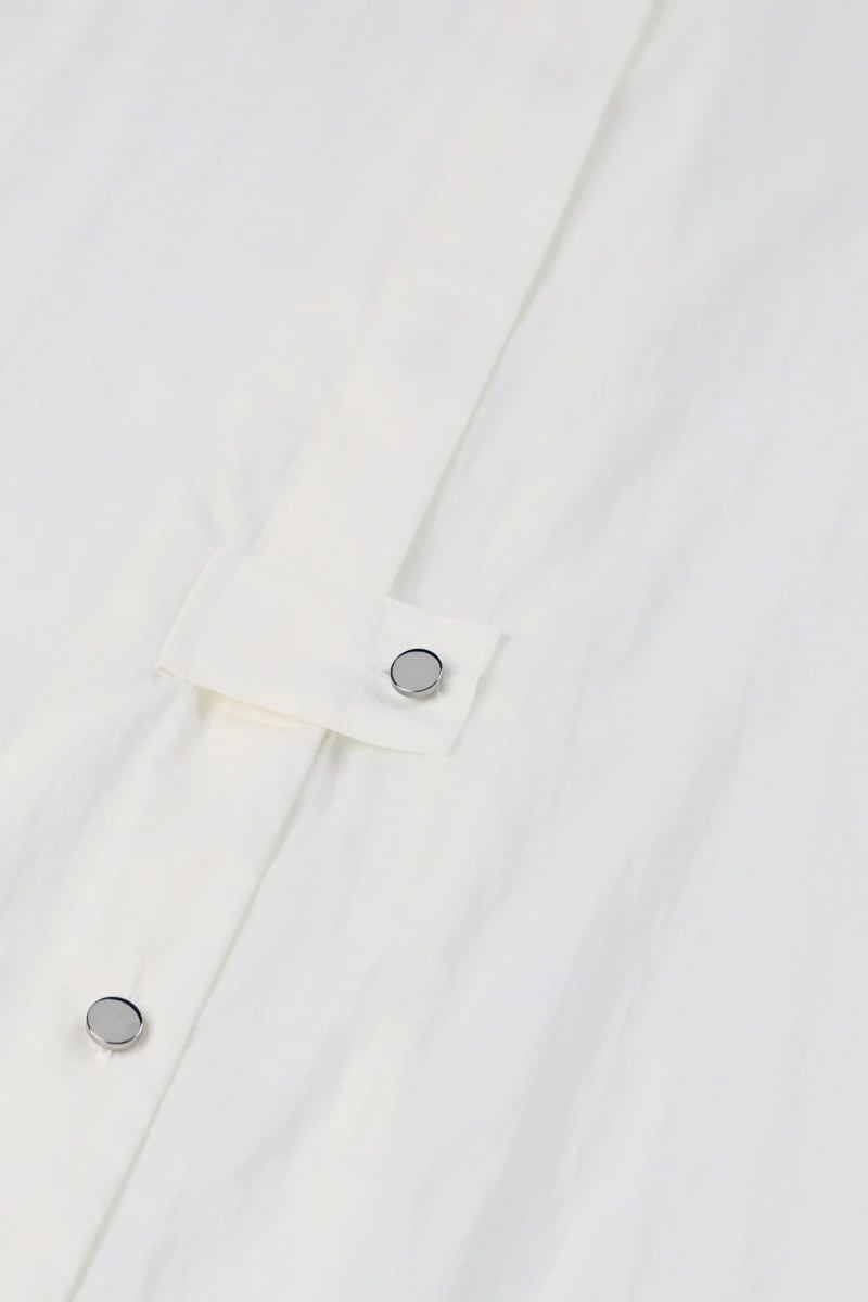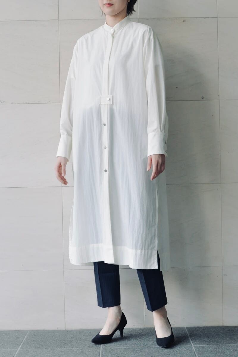 スタンドカラーの襟元やボタンを裏側に隠すデザインが、シックな雰囲気に。ボタンを外せば羽織りとしても活用でき、コーディネートの幅を広げる一着。