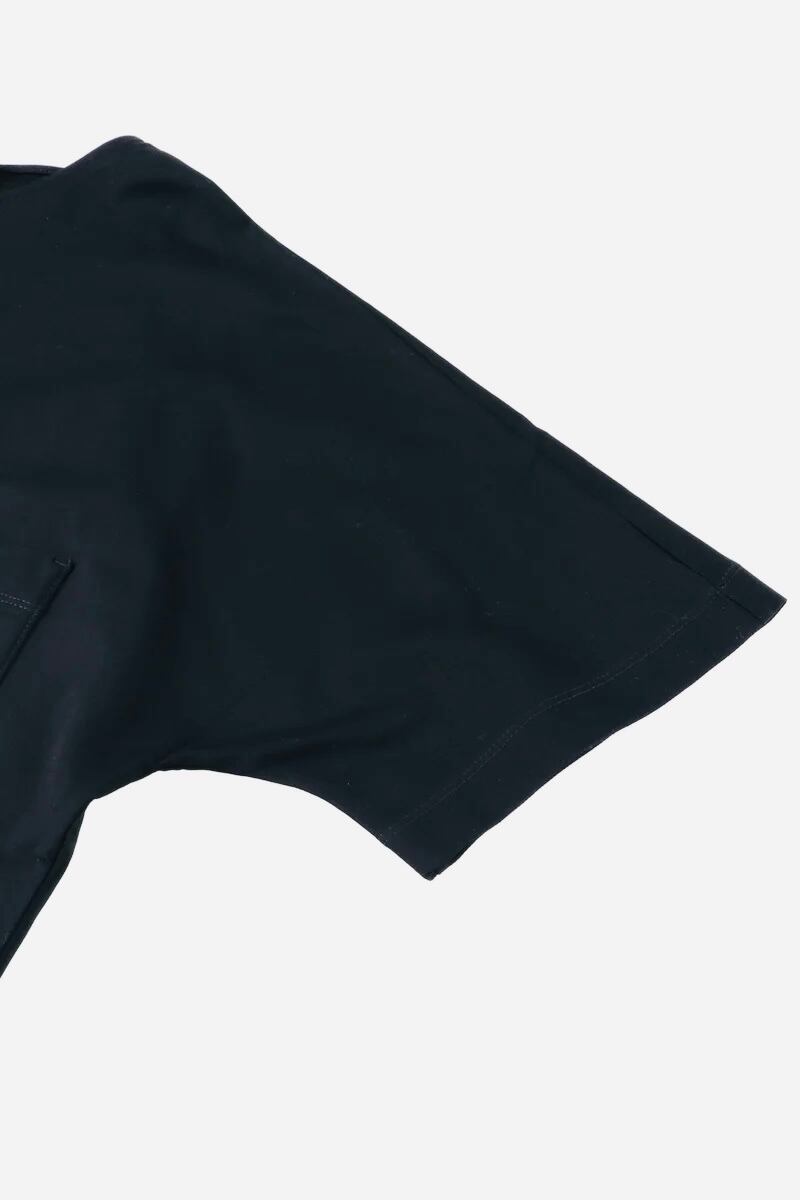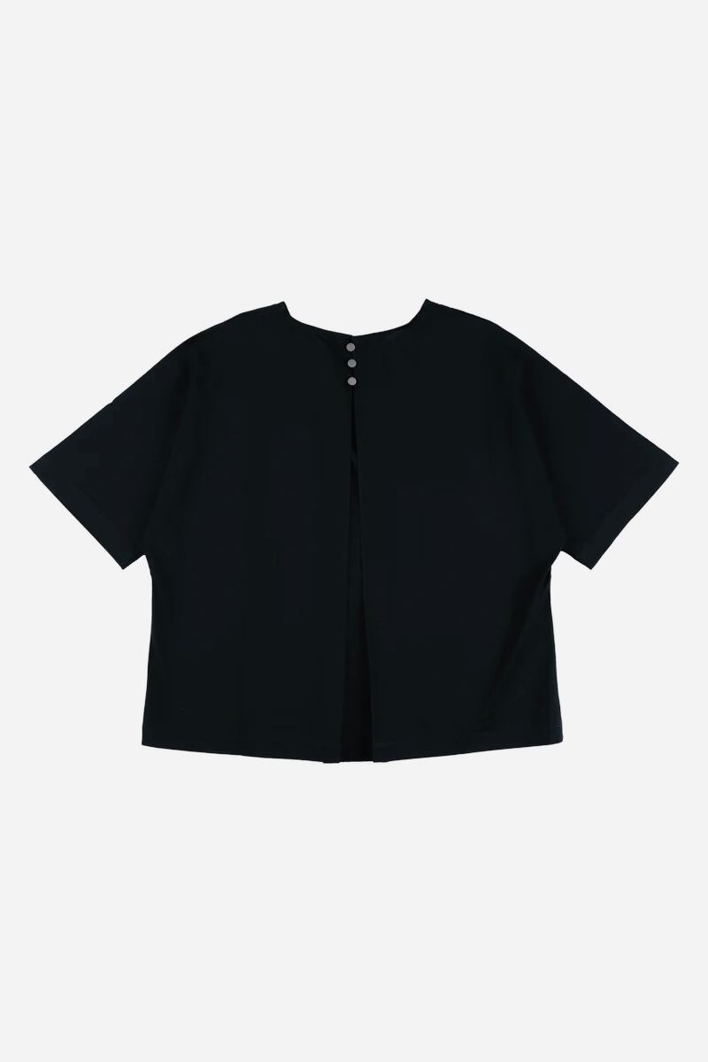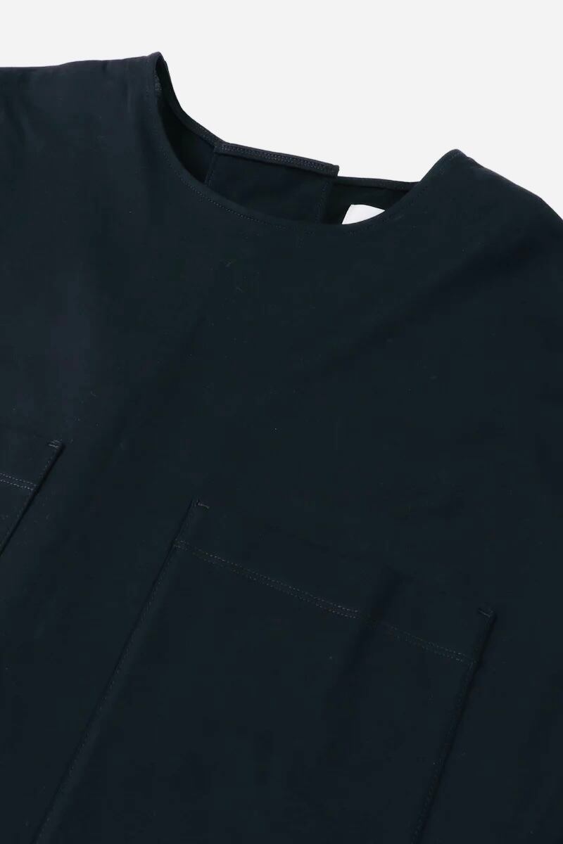胸元の2つのポケットが目をひく、オーバーシルエットのTシャツ。大きな四角形が幾何学模様に見える、モダンなデザイン。バックの襟元についたボタンが、ブラウスのようで上品な後ろ姿に。滑らかな肌ざわりと強度を持ち合わせた素材「ギザコットン」は滑らかで肌に優しい肌ざわりが特徴。着心地がよく、長く着用いただけるアイテム。