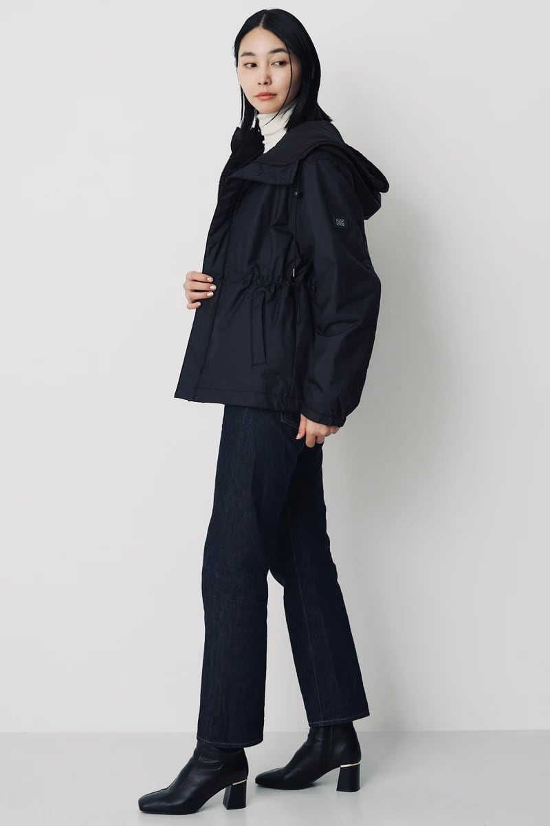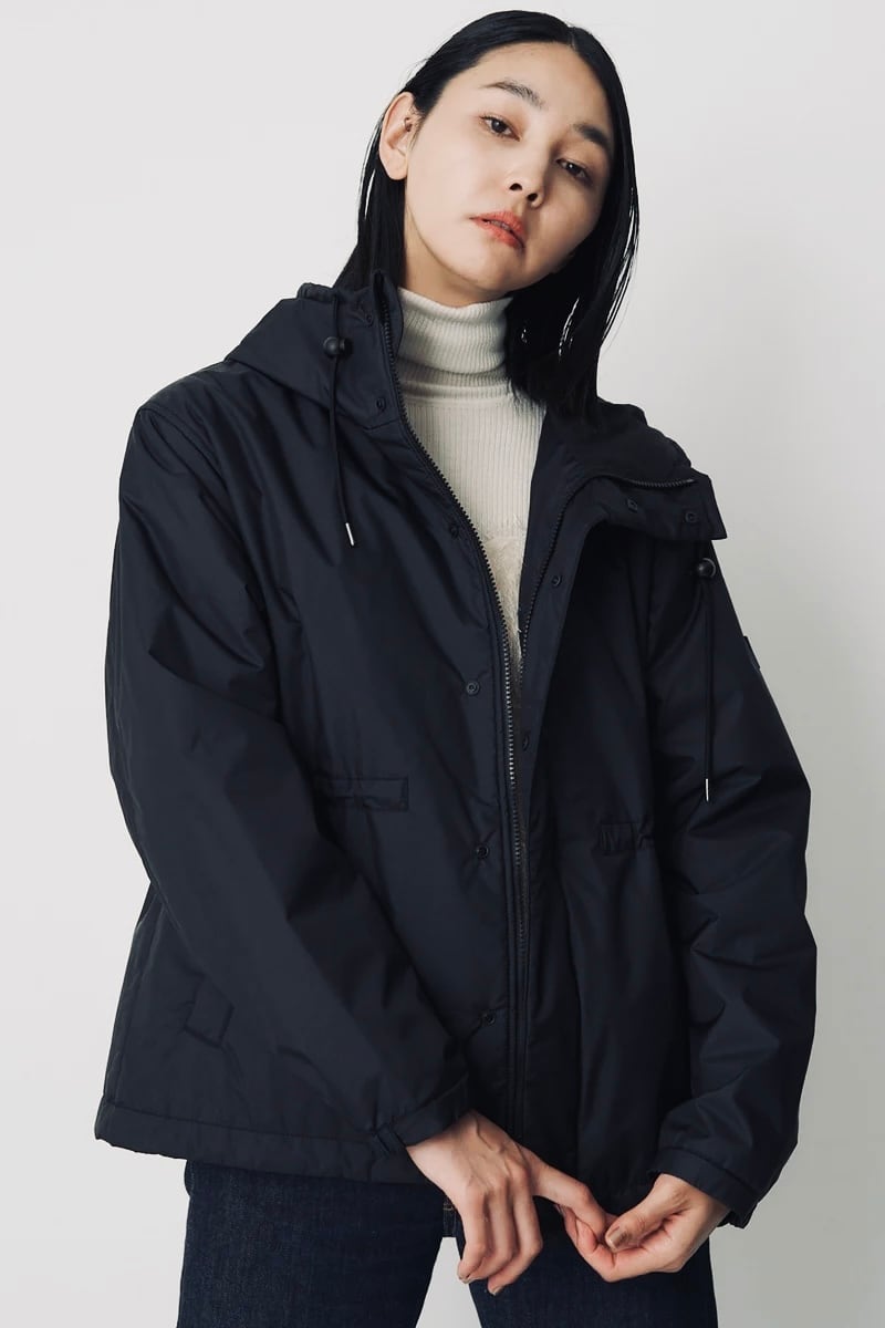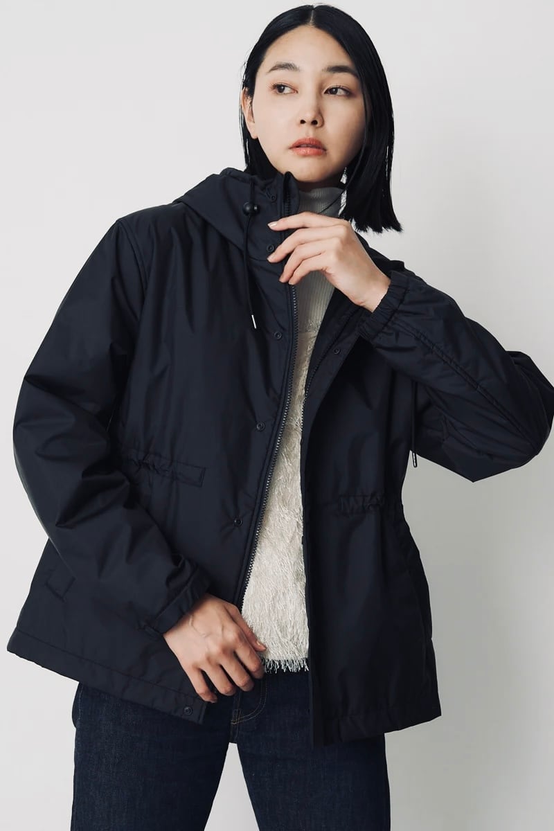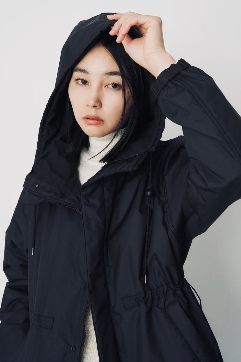 フードの裏地には起毛素材を使用しているので、フードをかぶった時に肌に触れても心地良い仕様になっています。またウエストにスピンドルが付いていますので、家で水洗いもできるため、ケアも簡単です。