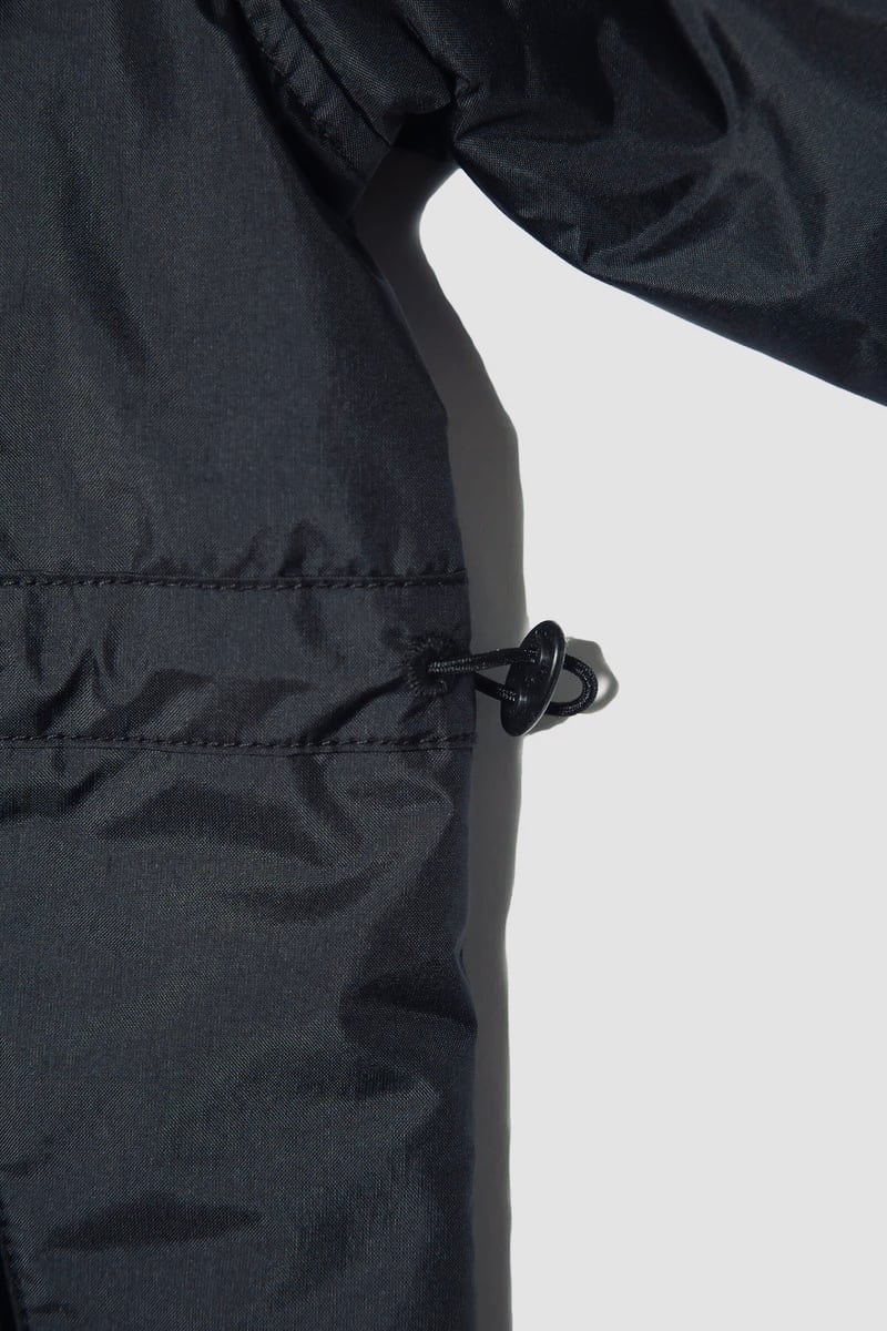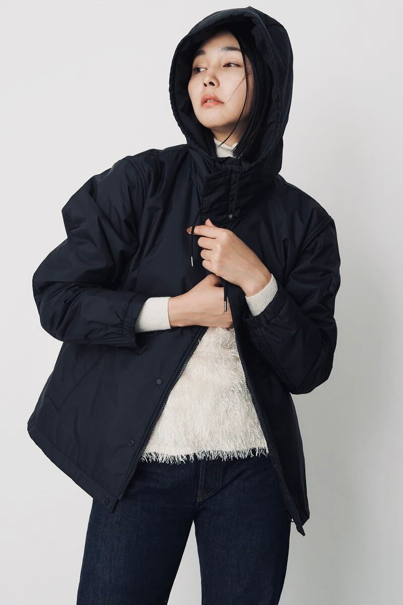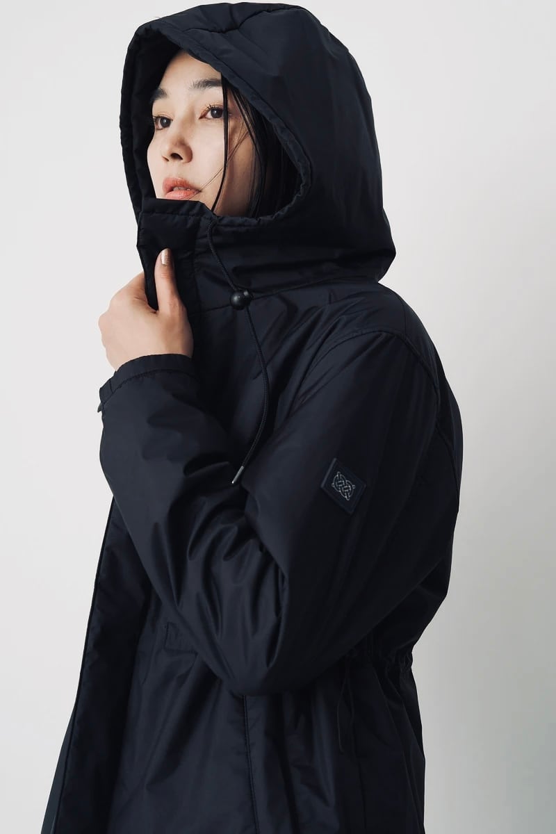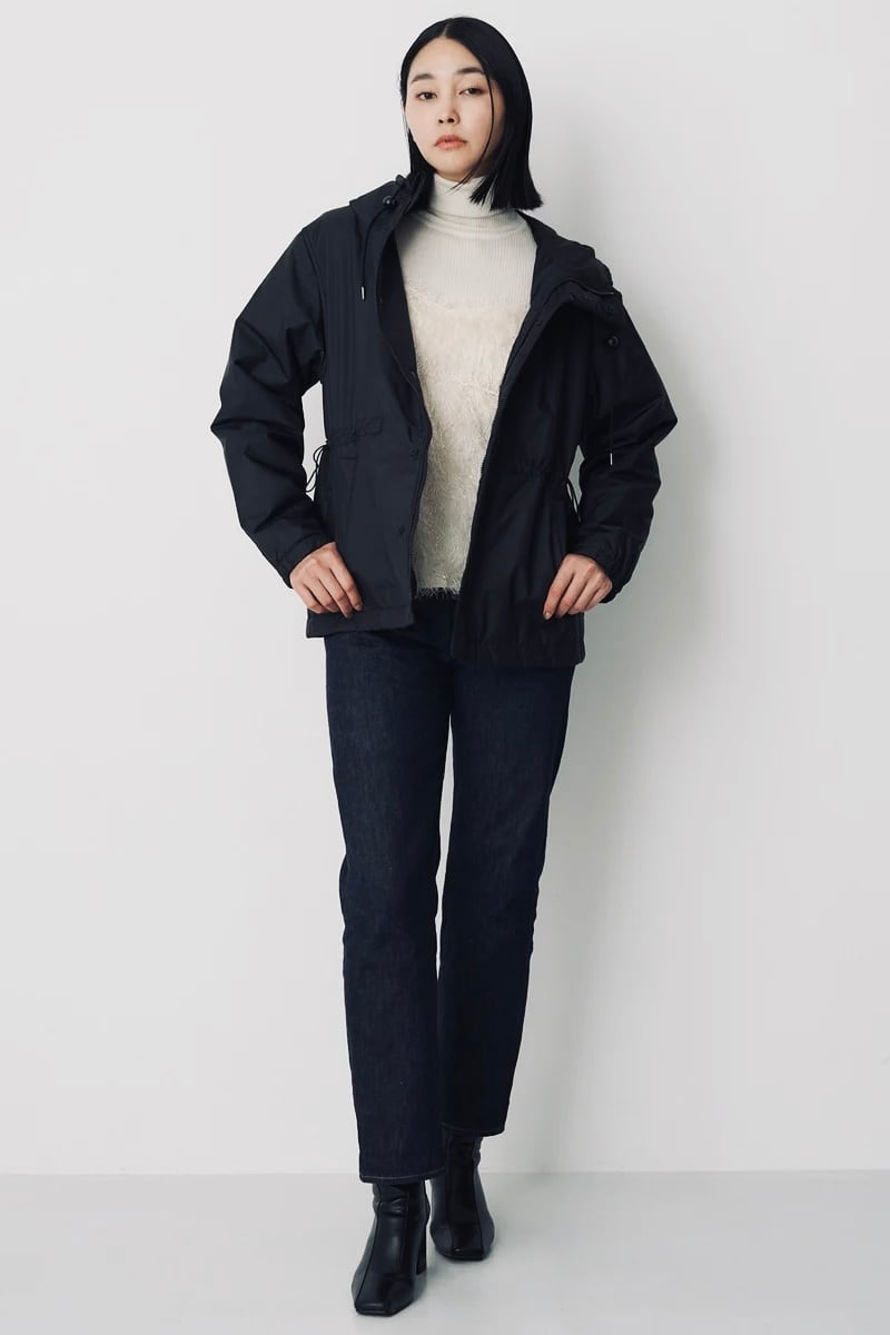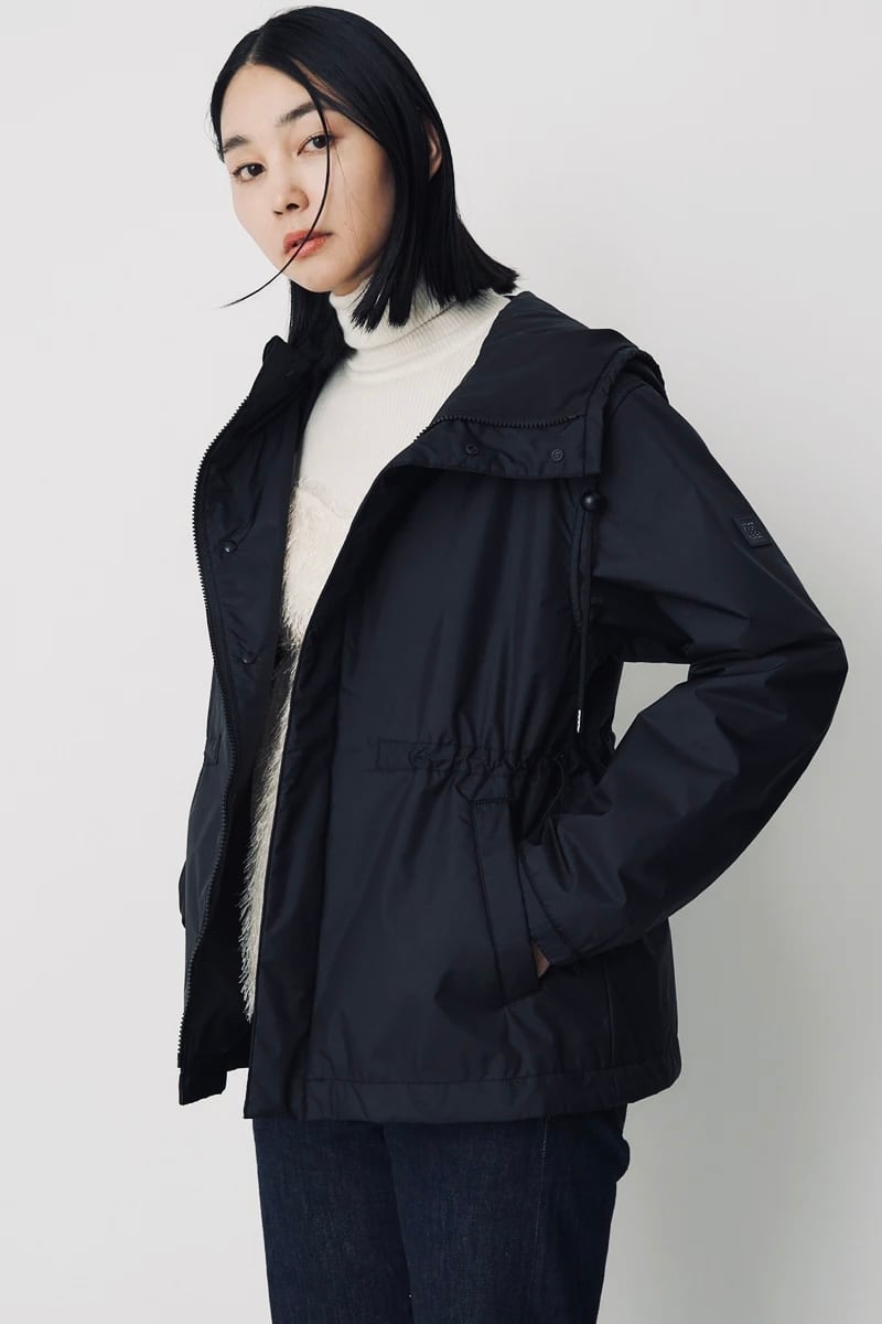 フードの裏地には起毛素材を使用しているので、フードをかぶった時に肌に触れても心地良い仕様になっています。またウエストにスピンドルが付いていますので、家で水洗いもできるため、ケアも簡単です。