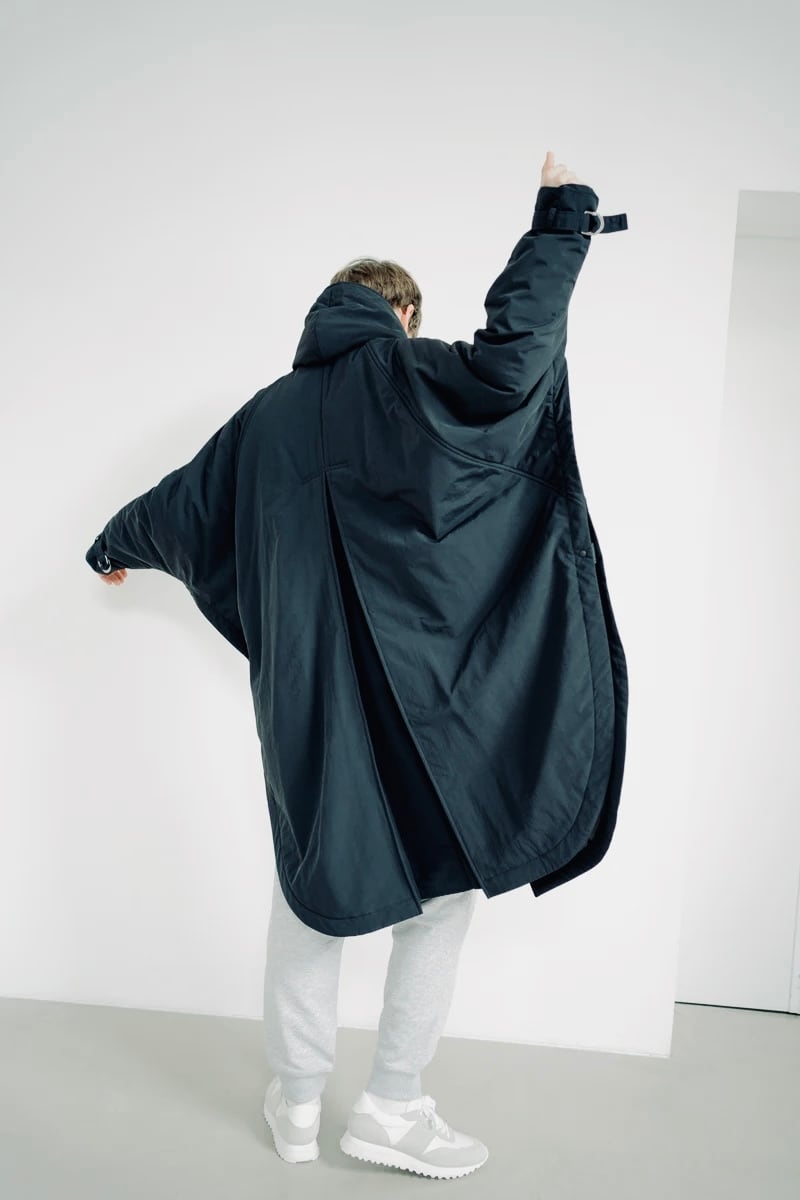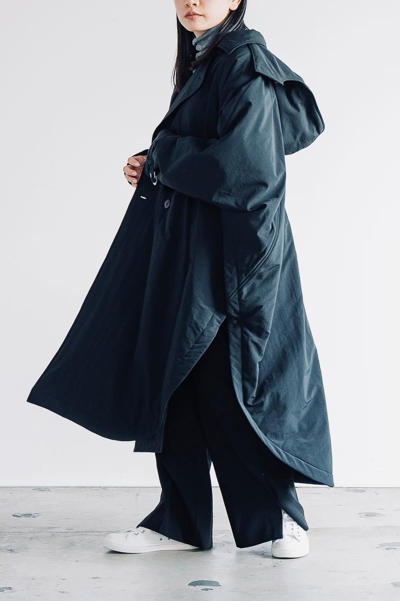カポックダウンの軽やかさをいかし、暖かさはキープしつつも、スタイリッシュなポンチョスタイルに仕上げました。サイドについたボタンでスリット丈や横幅のボリュームを調整でき、フードも取り外し可能、とフレキシビリティ溢れるデザインとなっています。